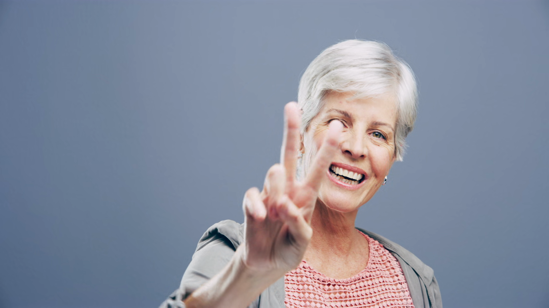 Happy Mature Woman And Hands For Peace Sign Or Freedom Emoji In Gray Background Studio Or MockupÂ
