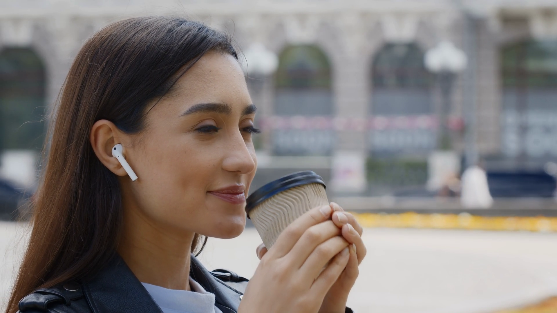 Happy Millennial Woman Drinking Coffee Standing In Urban Area OutdoorsÂ
