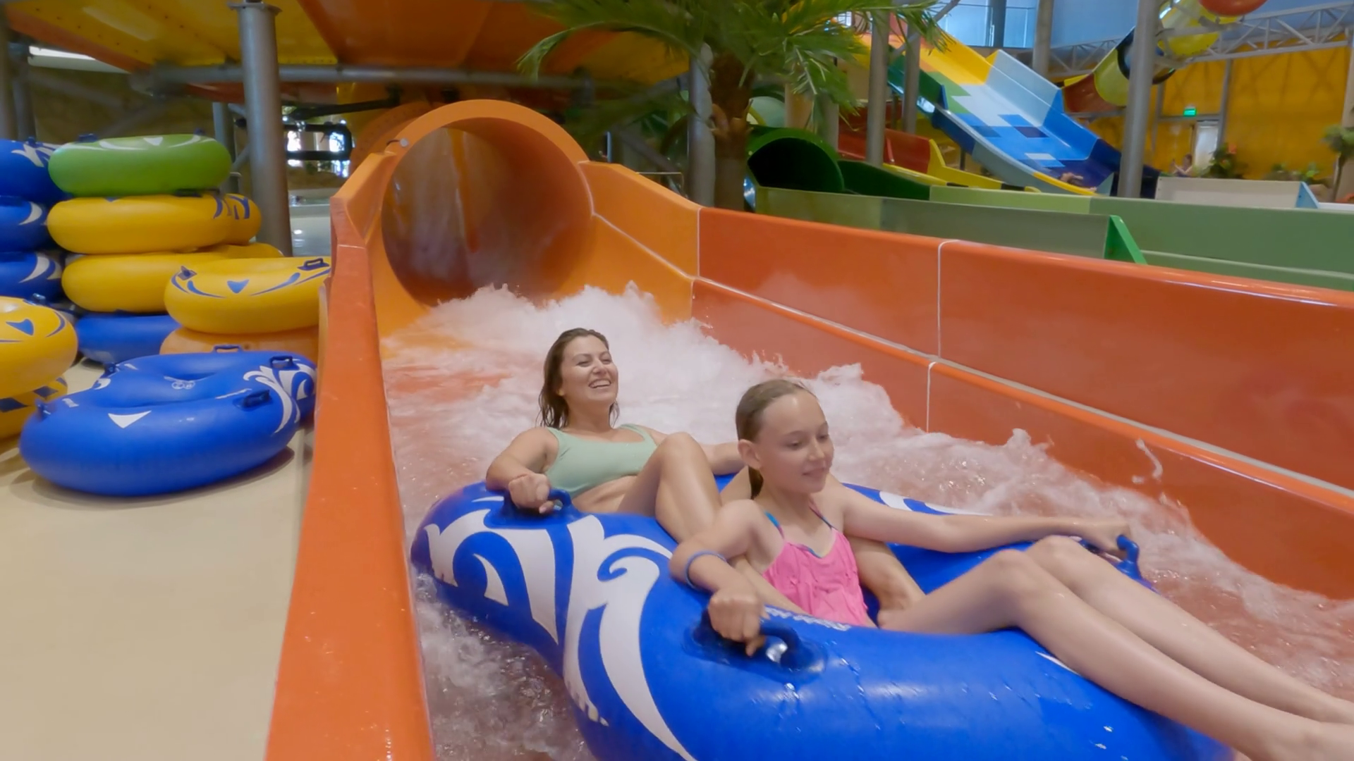 Happy Mom And Daughter Rolled Down Water Slide In Modern Amusement Aqua Park On Rubber Ring Water Extreme Entertainment At The Resort Vacation Active Lifestyle Recreation Leisure ActivitiesÂ