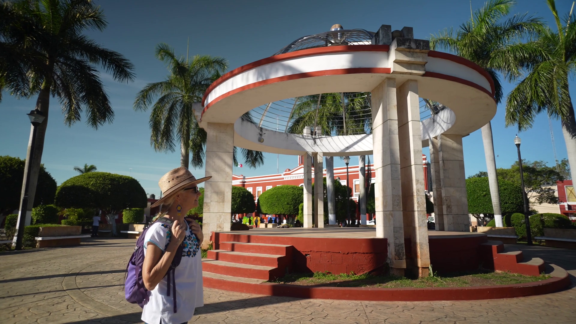Happy Smiling Mature Senior Man And Woman Couple Take A Selfie In Front Of The Municipal Palace In Motul Yucatan MexicoÂ