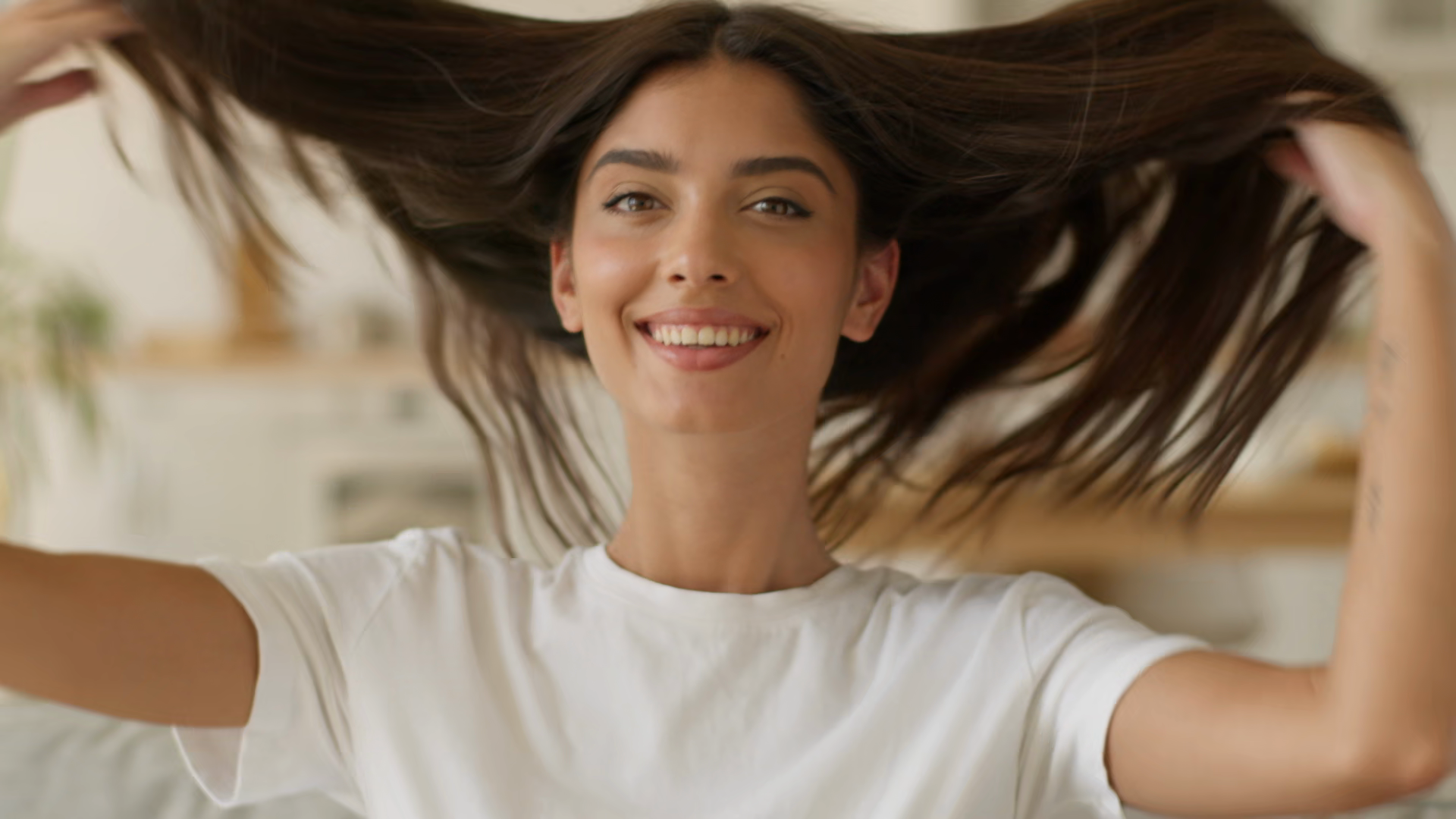 Happy Smiling Positive Beautiful Woman Indian Arabian Girl Female Lady Toothy Healthy Smile Attractive Pretty At Home Gorgeous Hair SmoothÂ