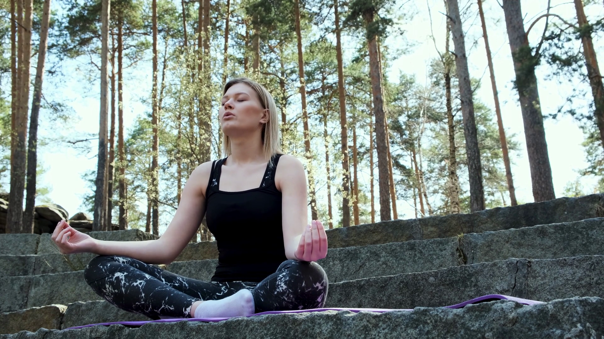 Happy Woman Deeply Connected With Nature Feels Unity And Meditating In Forest Outdoors Concept Blond Girl In Sports Suit Sitting OnÂ