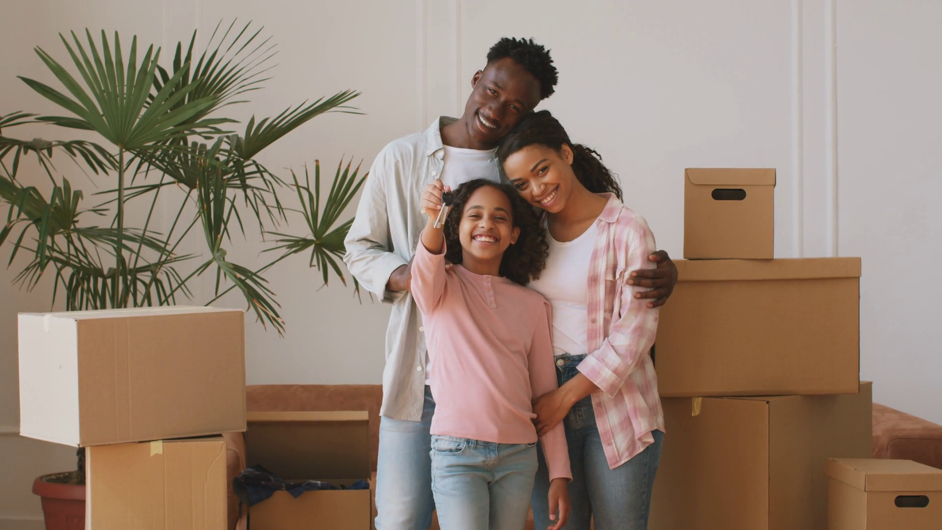 Happy Young Parents And Daughter Smiling Girl Showing Keys Posing In New HomeÂ