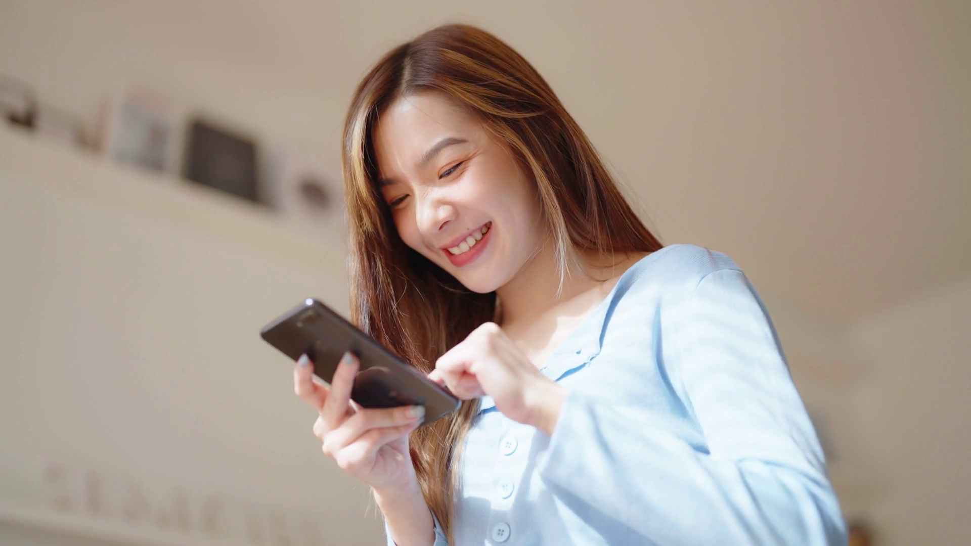 Young Woman Enjoying Her Time At Home Using Smartphone For Messaging Browsing And Online ShoppingÂ