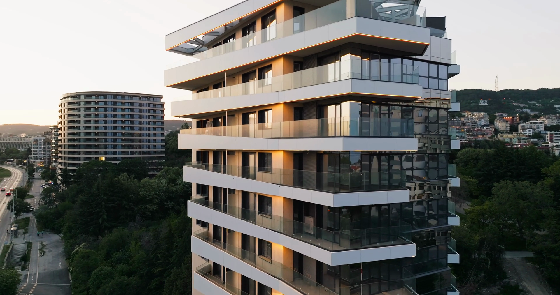 Highrise Condominium Futuristic Design Oceanfacing Aerial View Cars Navigate Roads Between Greenery Buildings Sunset Sky Blends Warm Cool Tones Creating Tranquil Urban AtmosphereÂ