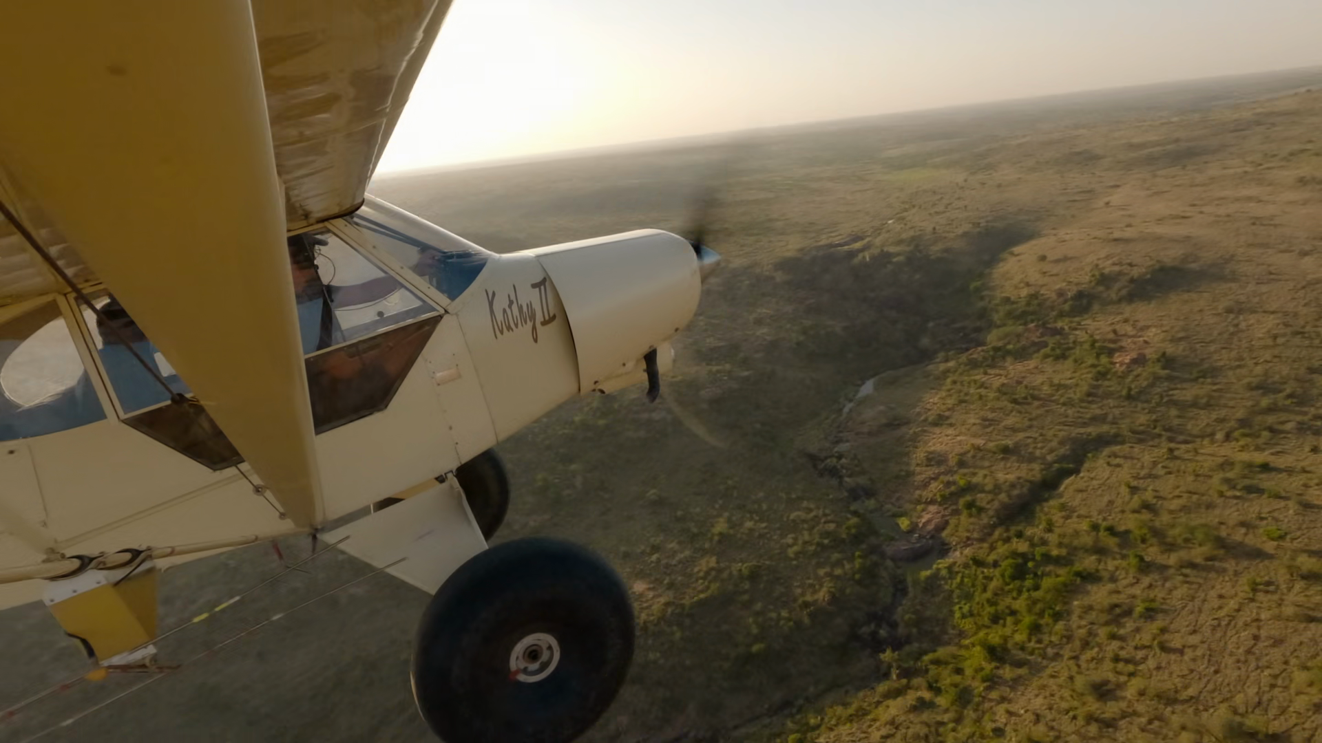 Hyperlapse Of Wide From Light Plane Flying Over Savannah With Aerial Of Vegetative Landscape Cliff And Hill And River At Sunset In KenyaÂ