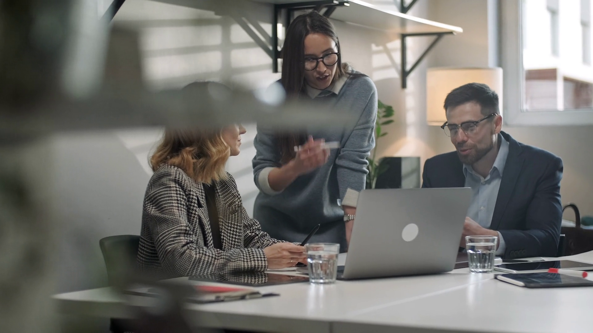 In Creative Office Productive Coworkers Standing At The Table Company Meeting Colleagues And Clients Talking Strategy With Laptop And TabletÂ