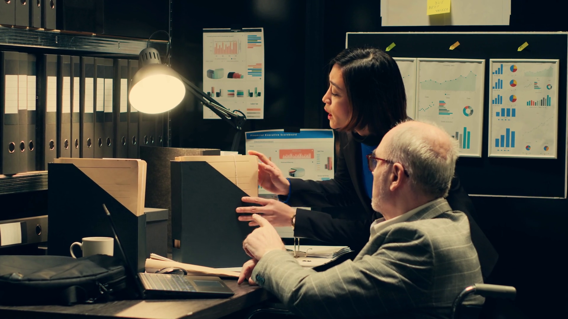Inspector Consulting With Criminal Expert On Archived Materials And Autopsy Records Examining Folders And Old Cases To Find ConnectionsÂ