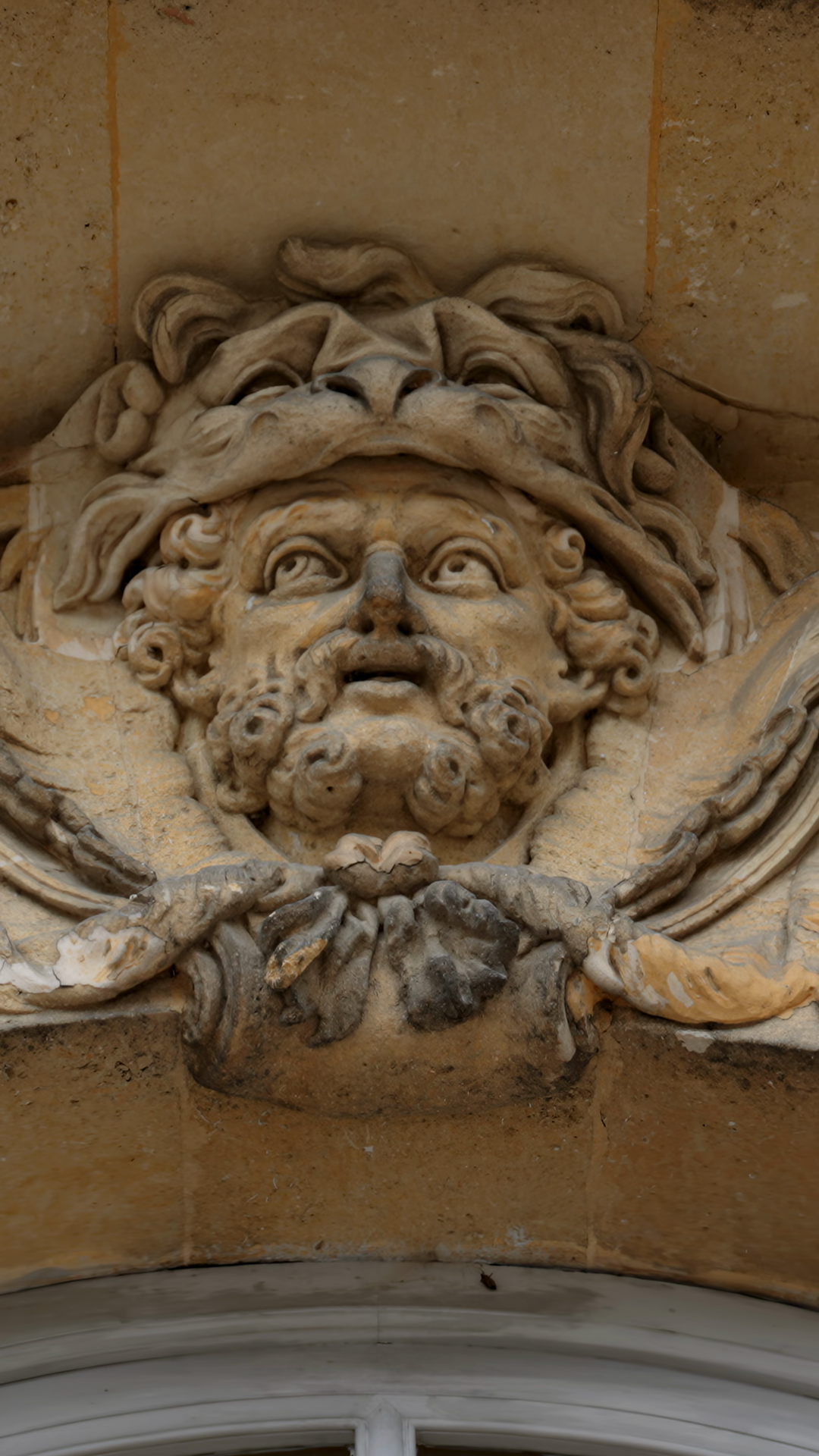 Intricate Bearded Keystone Design Weathered Limestone Mascaron With Wreath And Drapery DetailsÂ