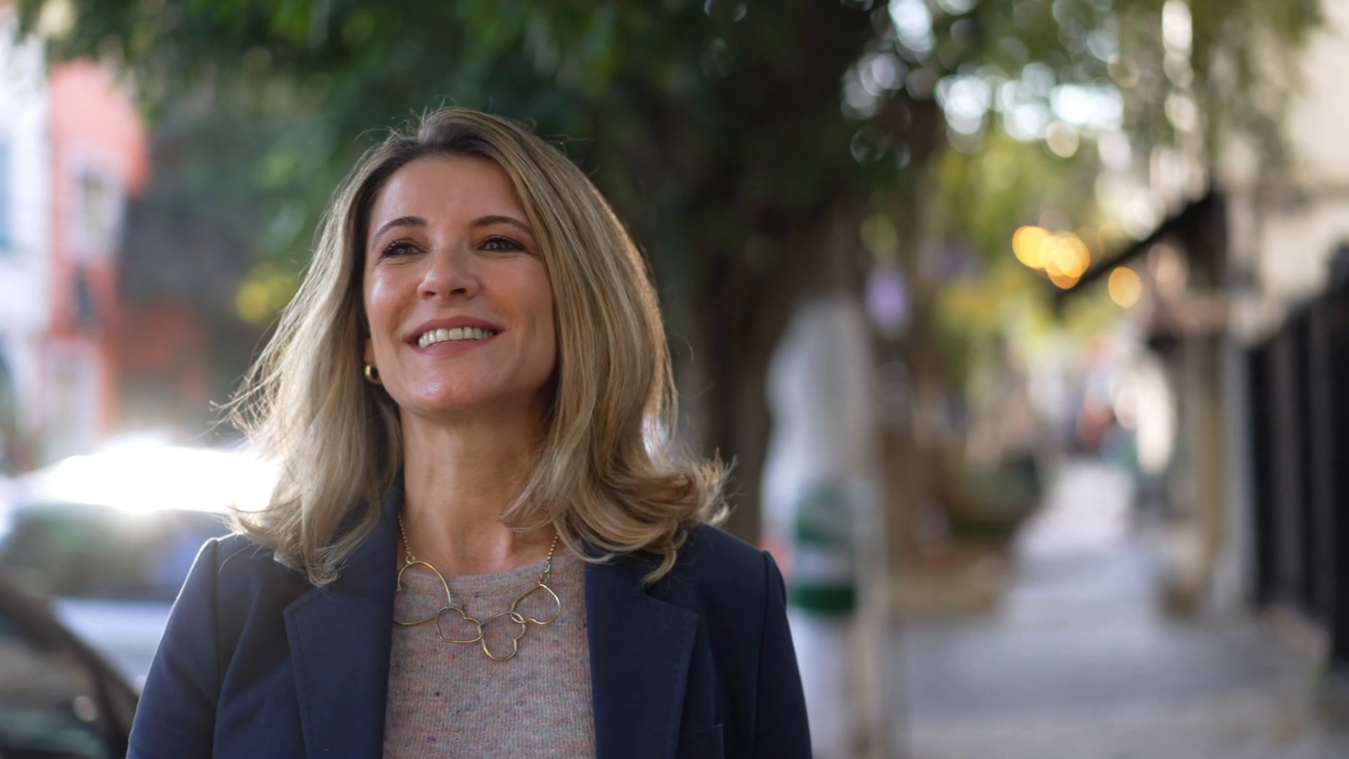Joyful Urban Stroll Mature Middleaged Woman Walks Happily Outdoors In Urban City Street Portrait Of A Content Older LadyÂ