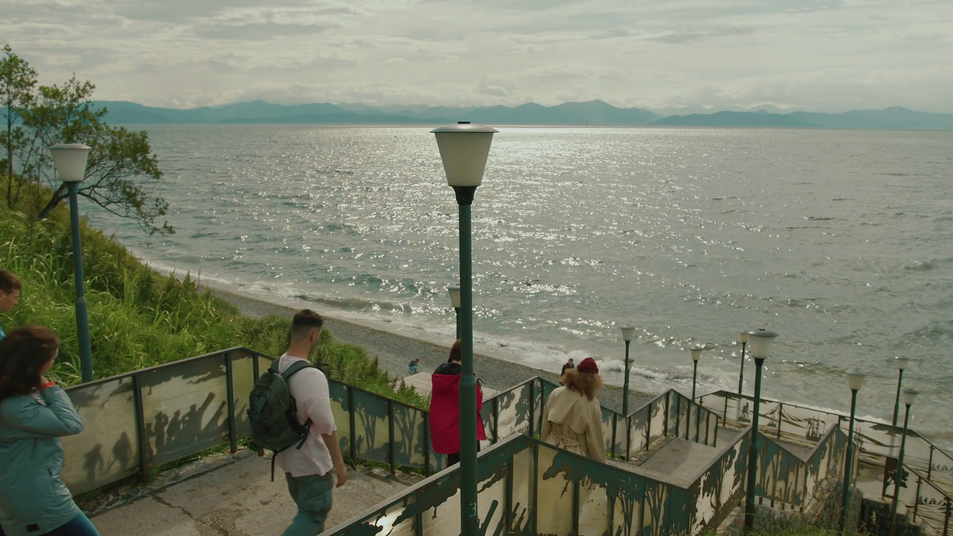 Kamchatka Russia August 25 2025 Group Of Young Men And Girls Walk Down Staircase Onto Shore Of Sea Bay With Water Sparkling In Sun AndÂ