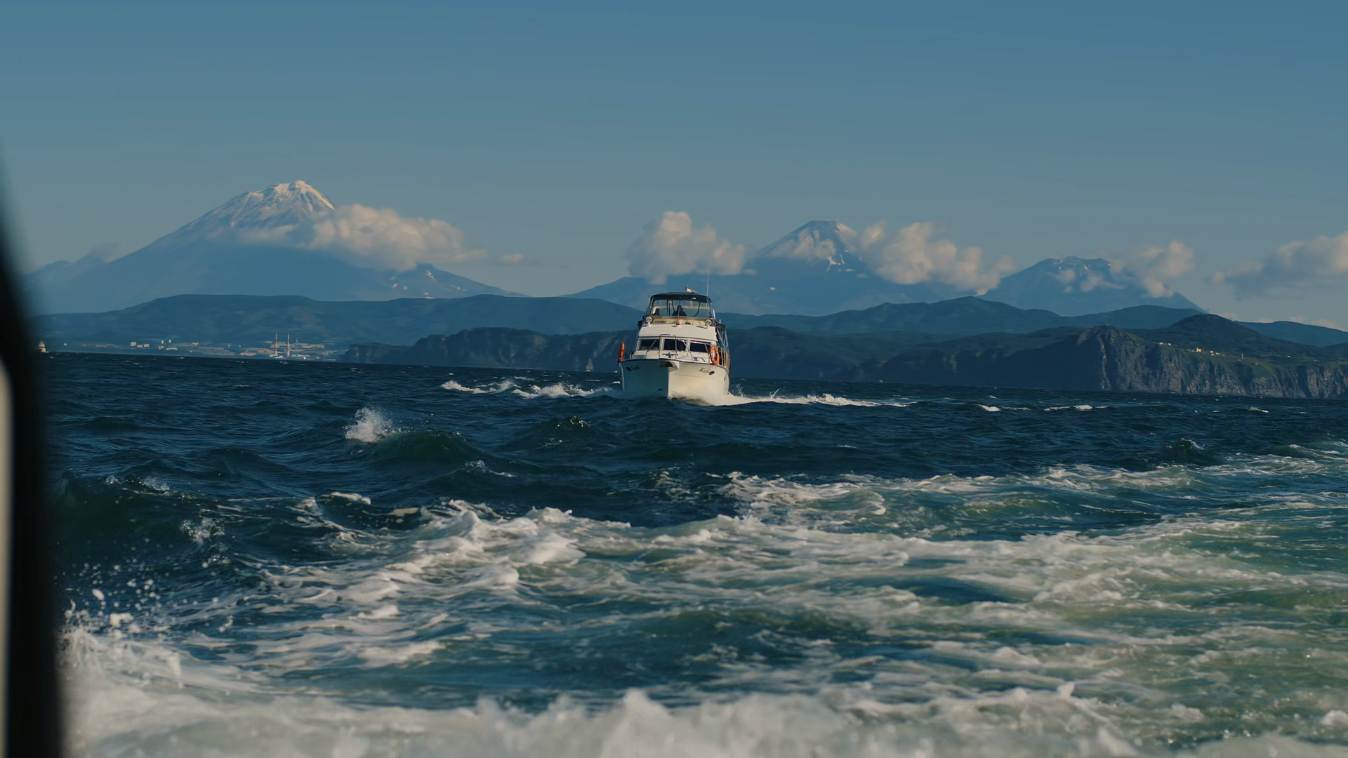 Kamchatka Russia August 26 2025 Touristfilled Yachts Depart From Avacha Bay Overlooking City On Mountainous Coast And Volcanoes InÂ