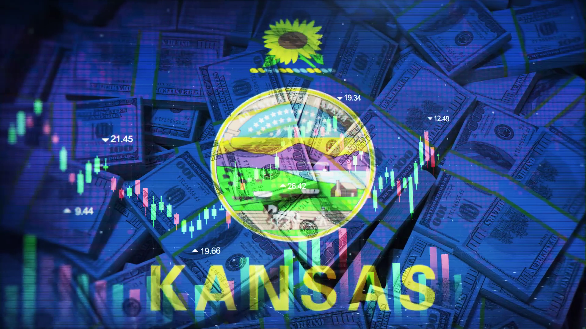 Kansas Flag On Economic Background With Decrease Bar Chart Graph And Arrow