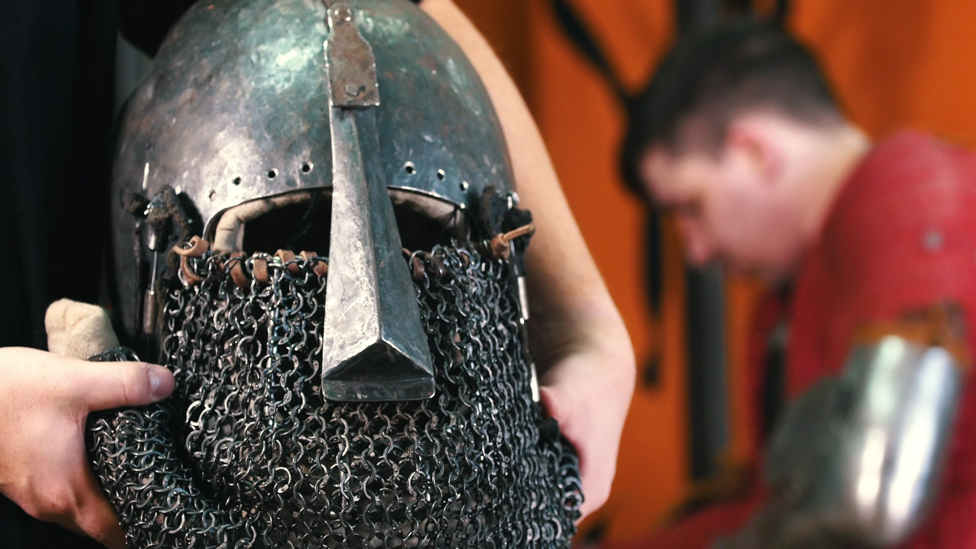 Knights Training A Man Holding A Protective Metal HelmetÂ