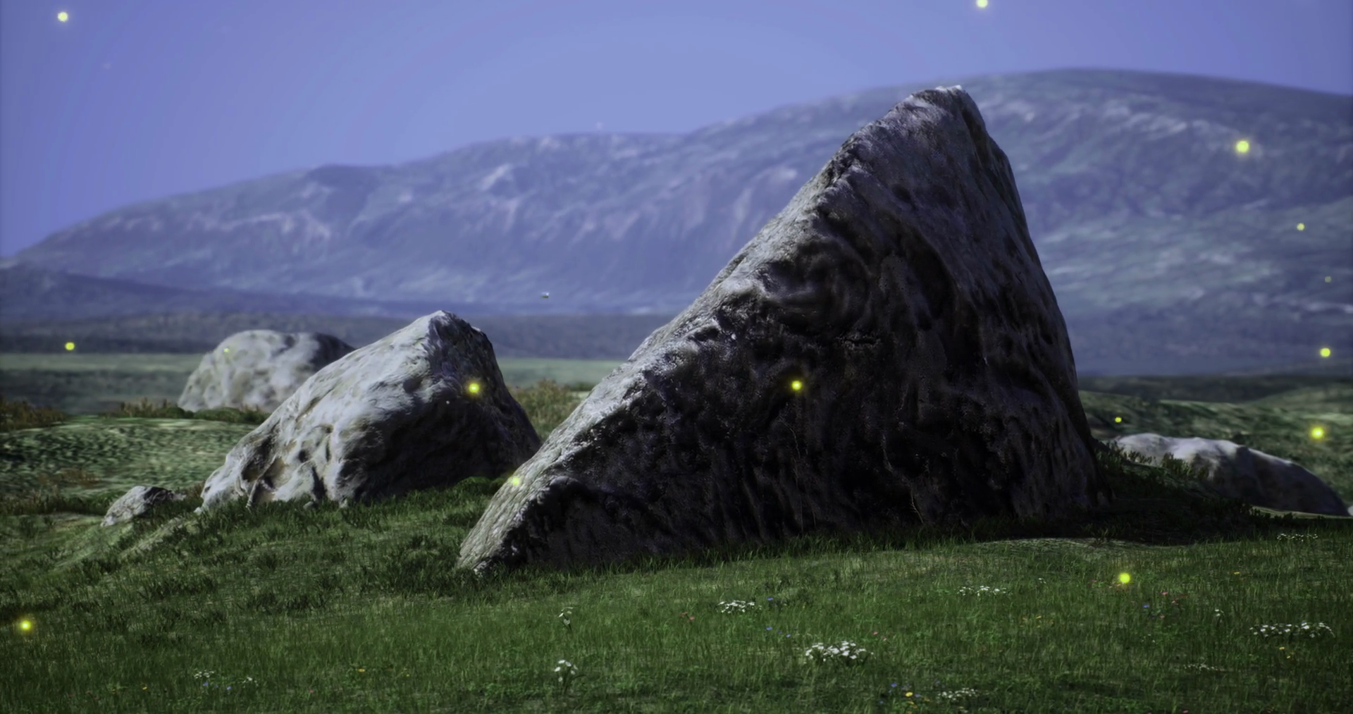 Large Rocky Formation Illuminated By Fireflies At Dusk In A Serene Landscape