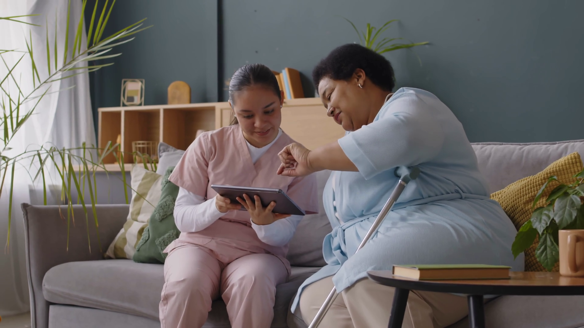 Latin Young Nurse Showing African American Senior Female With Cane Funny Pictures On Digital Tablet While Sitting On Sofa In Living RoomÂ