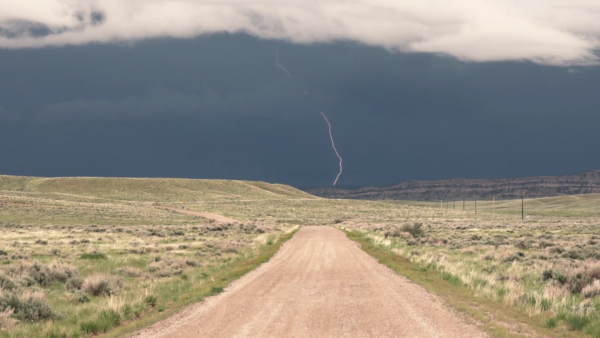 Lightning Strikes In Dark Stormy Clouds At The End Of A Dirt Road In A Desolate LandscapeÂ