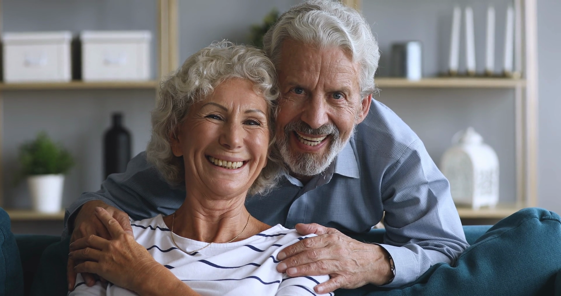 Loving Elderly Husband Embracing Sitting On Couch Smiling Hoary WomanÂ