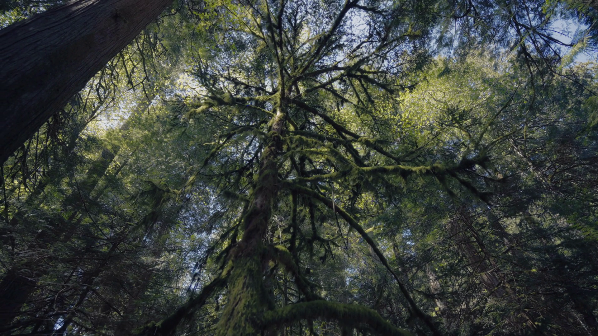 Low Angle Shot Of An Old Forest With Tall Douglas Fir Trees Covered In Moss Slow MotionÂ