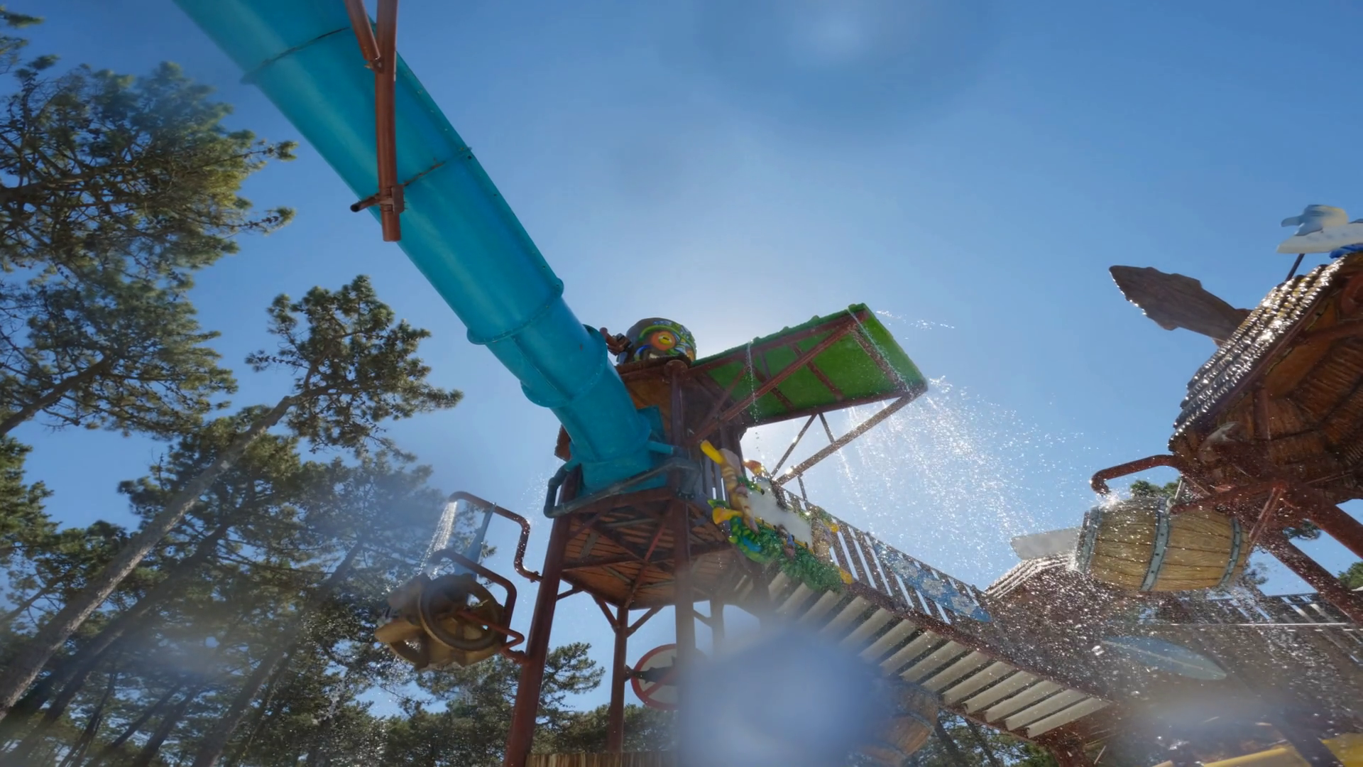 Lowangle View Of A Colorful Water Park Structure With A Bright Blue Slide Wooden Platforms And Buckets Spilling Water Under A Clear BlueÂ