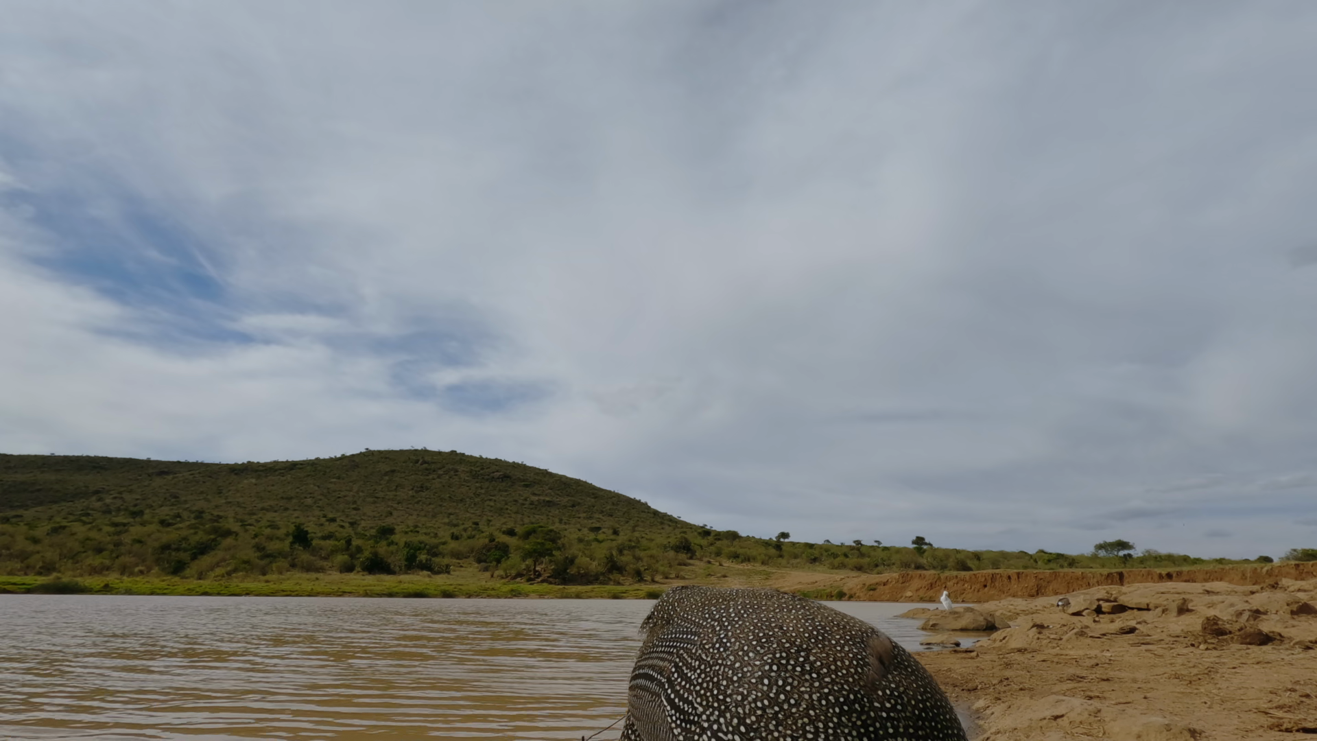Low Wide Angle Of A Helmeted Guinea Fowl Numida Meleagris Walking Away From Camera Near A Watering Hole At Midday In KenyaÂ