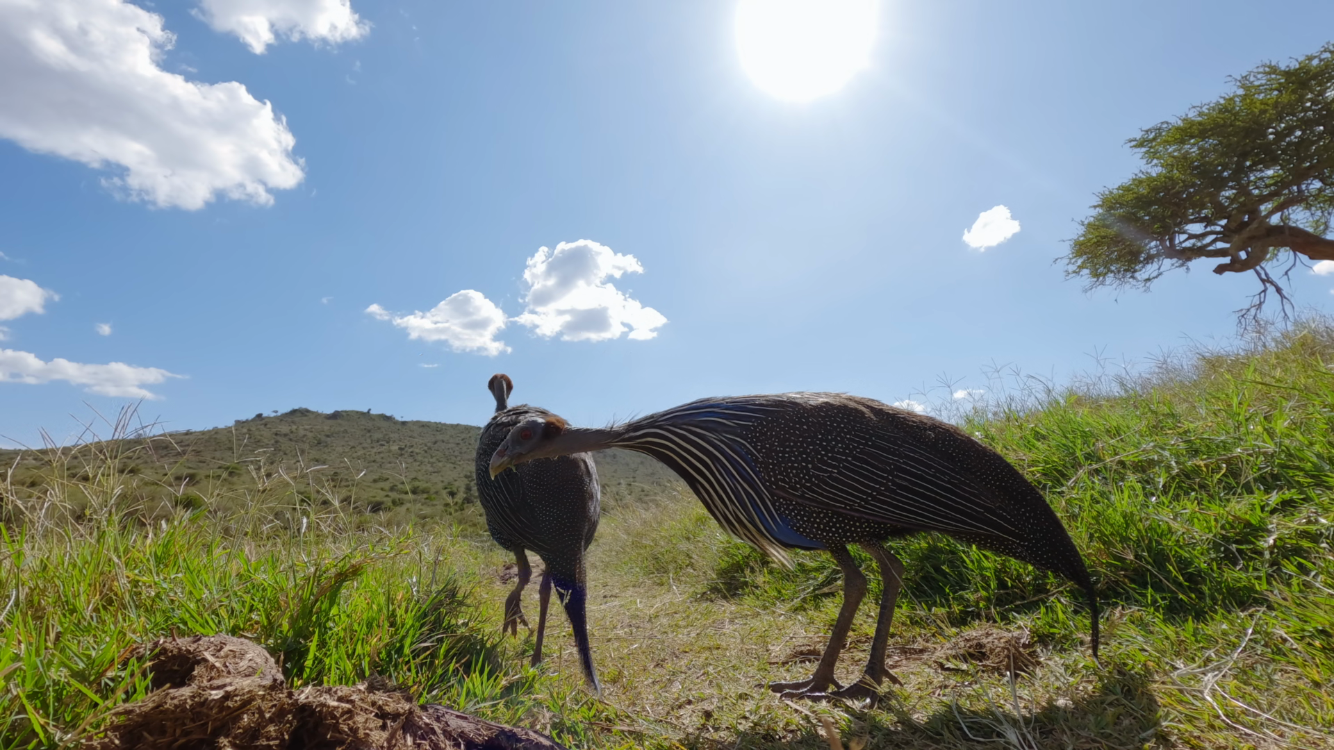 Low Wide Angle Of Vulturine Guinea Fowls Acryllium Vulturinum Walking Away From Camera In Short Green Grass Under Midday Sun In KenyaÂ