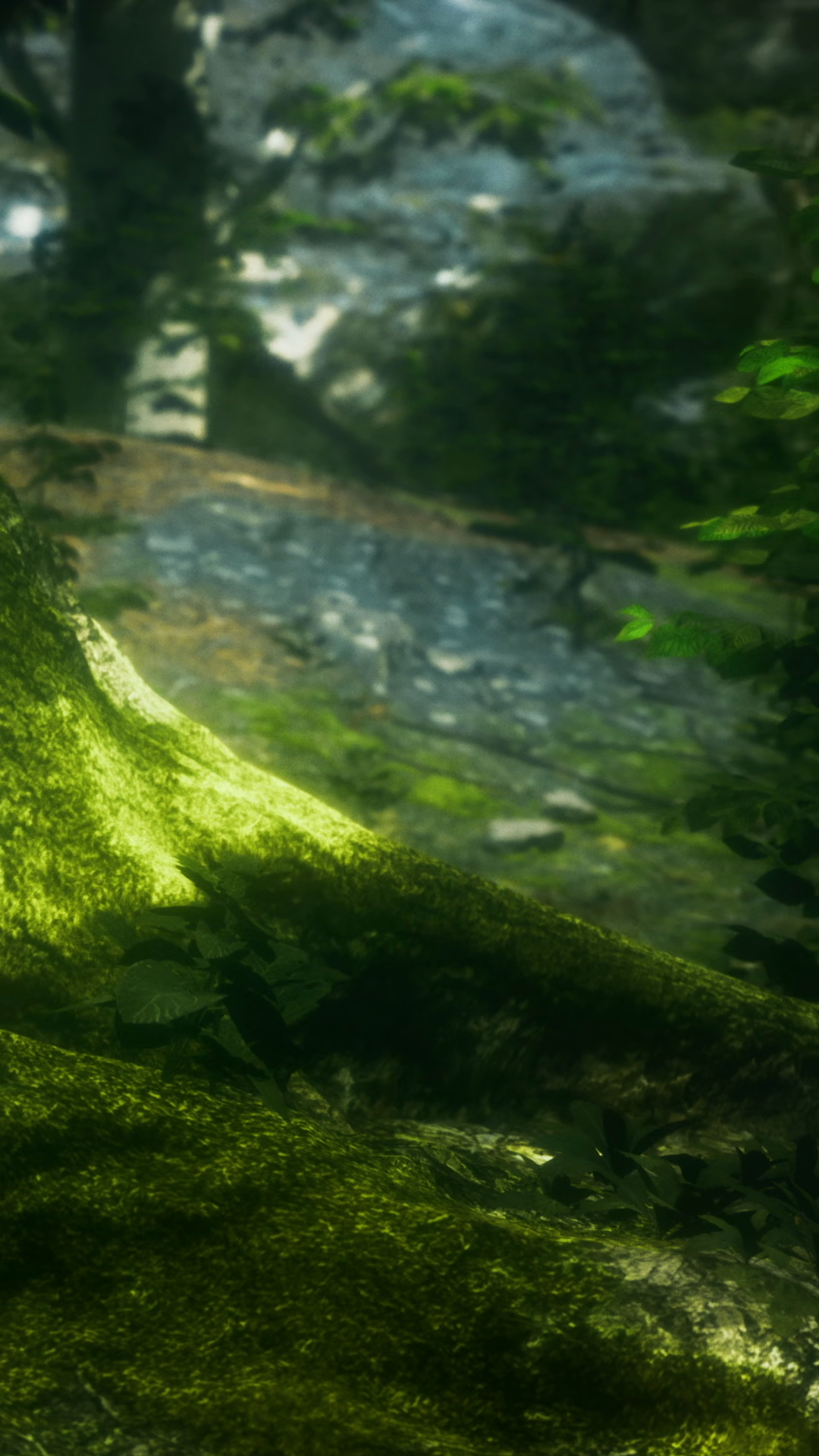 Lush Forest Scene With Tree Roots And Flowing Water In A Natural Setting