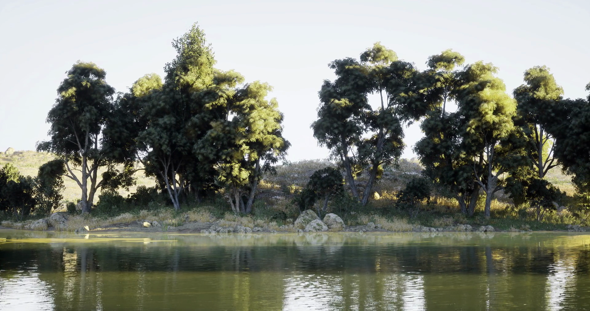 Lush Green Trees By A Calm River Reflecting A Serene Landscape In The Afternoon