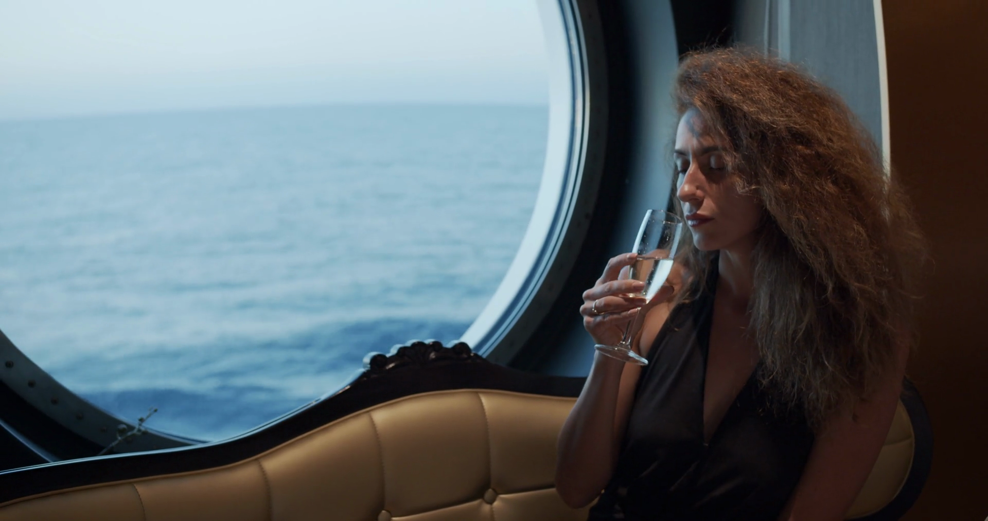 Luxury Lifestyle Woman Drinking Champagne Elegant Lady Holding Wine Glass And Looking On Window Over The Ocean Enjoying Amazing View On Luxury Vacation Â