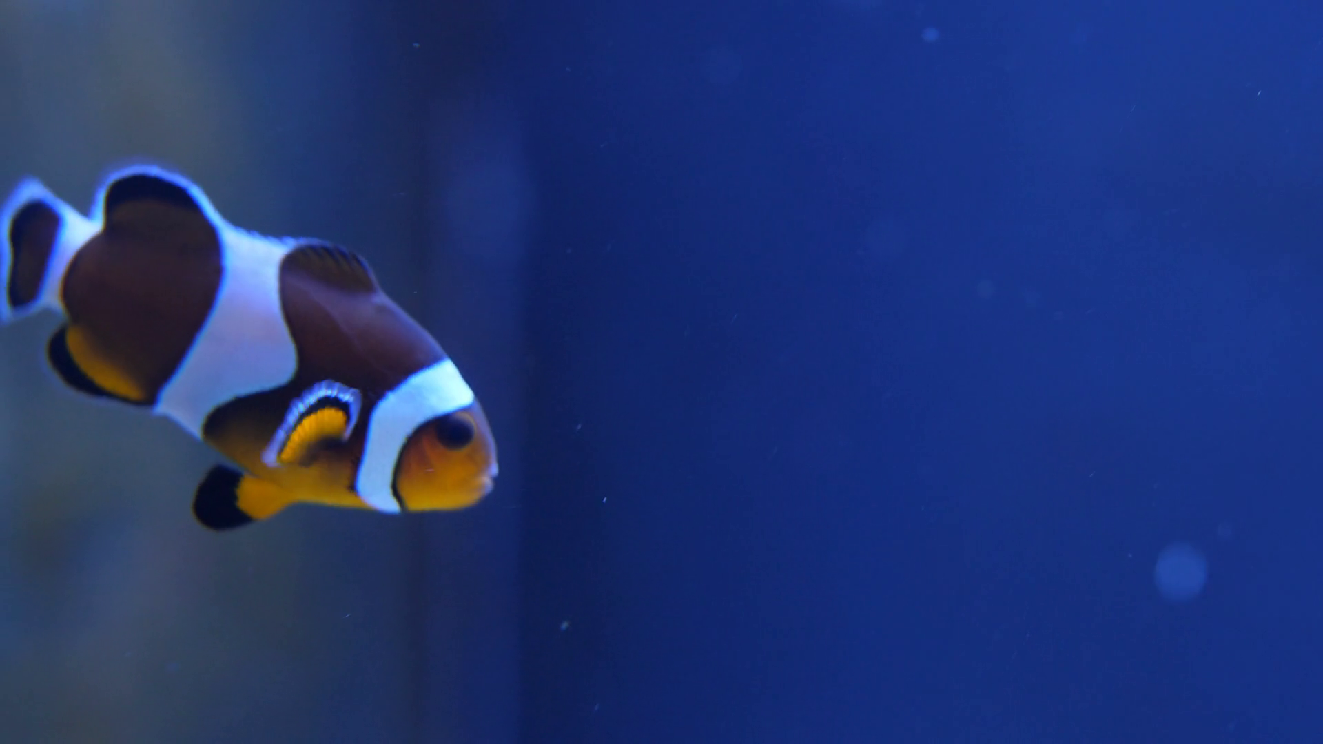Macro Clownfish Shot Swimming Out Of Frame Blue BackgroundÂ