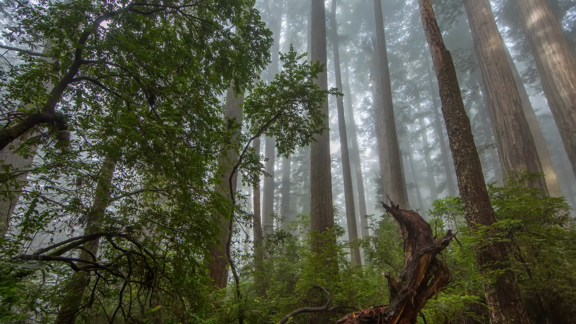 Majestic Coastal Redwoods In Foggy Forest Redwood National Park