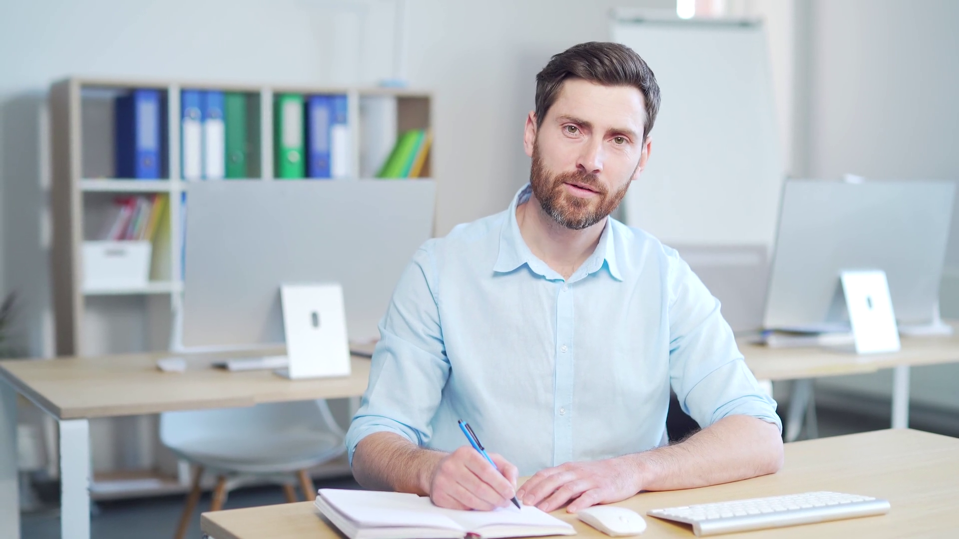 Male Employee Entrepreneur Office Worker Listening Online Conference Training Writing In Notepad Sitting At Computer Desk At Office Workplace Attentively Study Lecture Looking At Camera Webcam ViewÂ