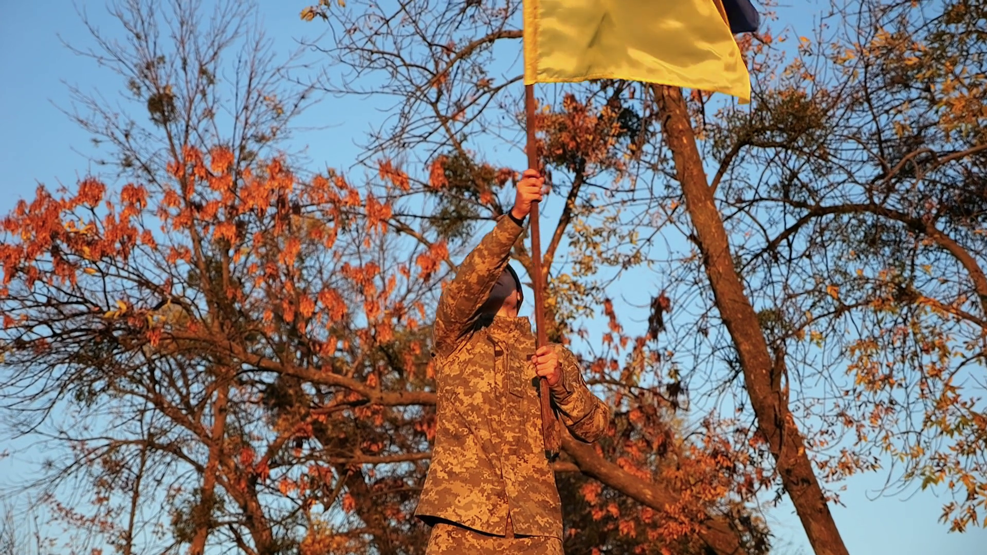 Male Ukrainian Army Soldier Waving Flag Of Ukraine To Peak Of Hill At Sunset Young Man In Military Uniform Lifted National Banner AtÂ