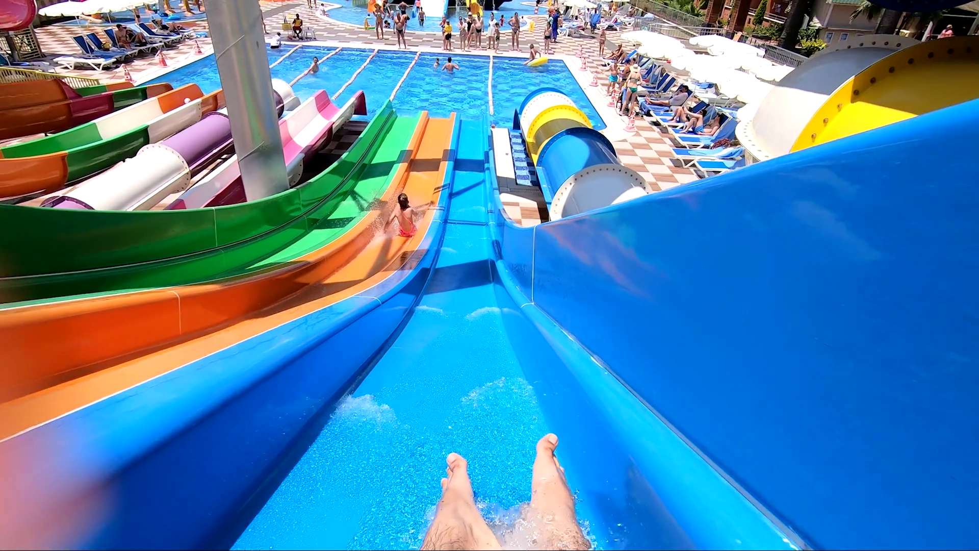 Man Having Fun On A Water Slide Cool People Having Fun On The Water Slide In The Aqua Fun Park Glides Playing Happy And Water Splashes Are All OverÂ