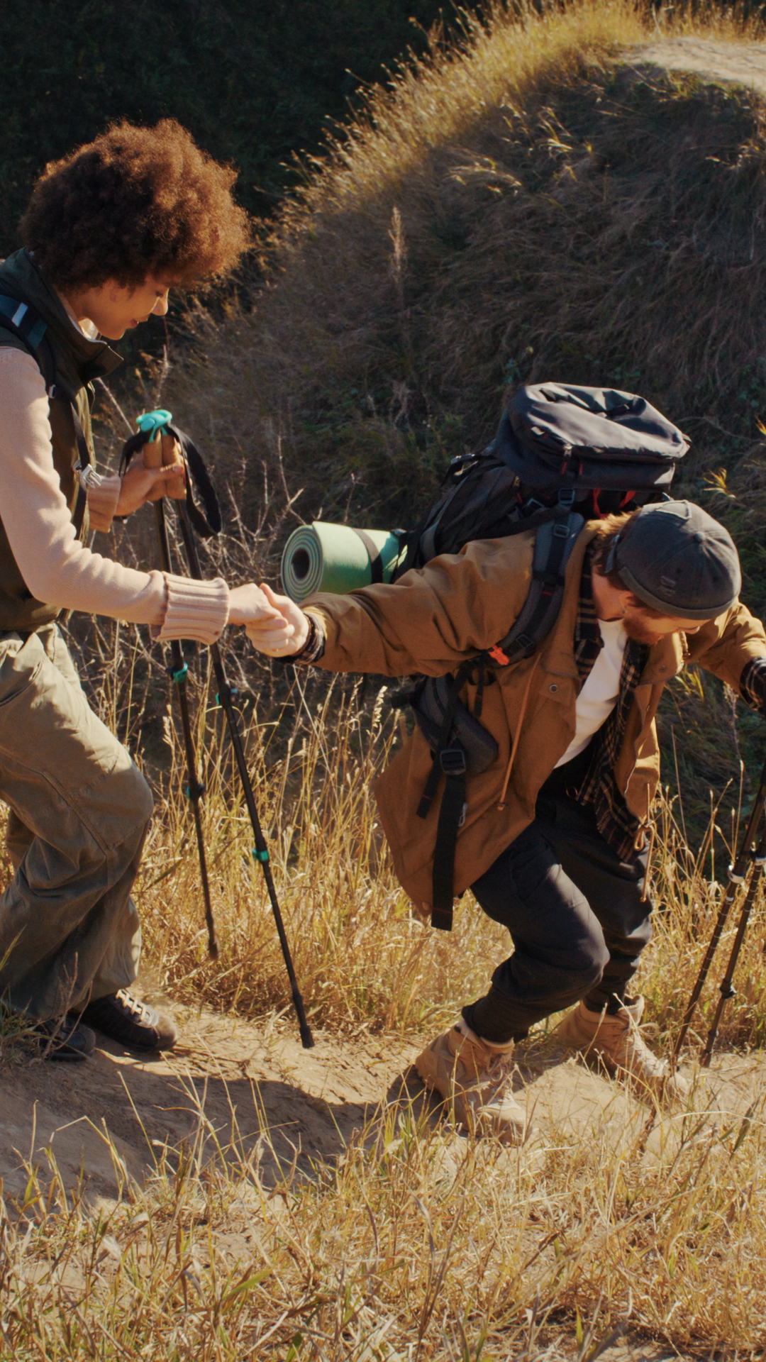 Man Passes Steep Slope And Helps African American Wife With HandÂ