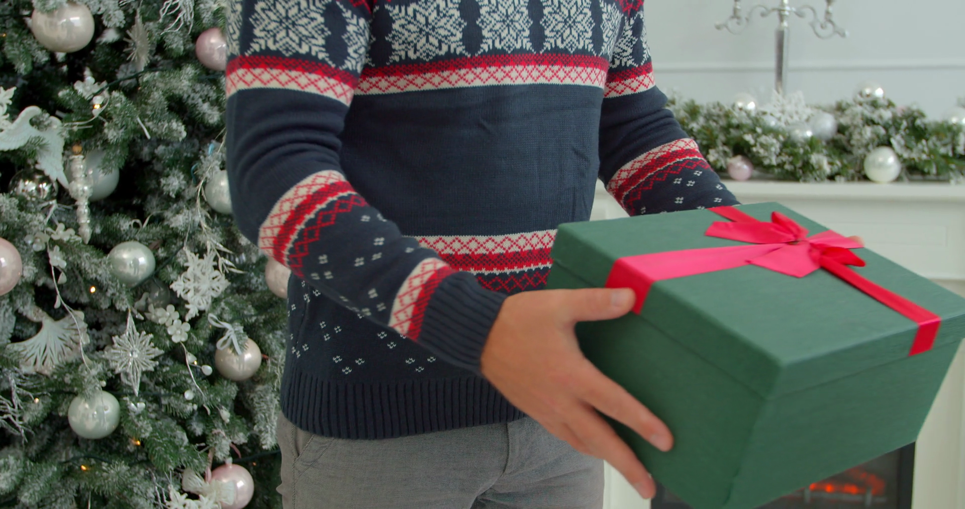 Man Receiving A Gift Box From Sweetheart Holding A Present Near New Year Tree Enjoying Family Fun Celebration Best Wishes On Birthday Or Xmas Gift Store Ideas ConceptÂ