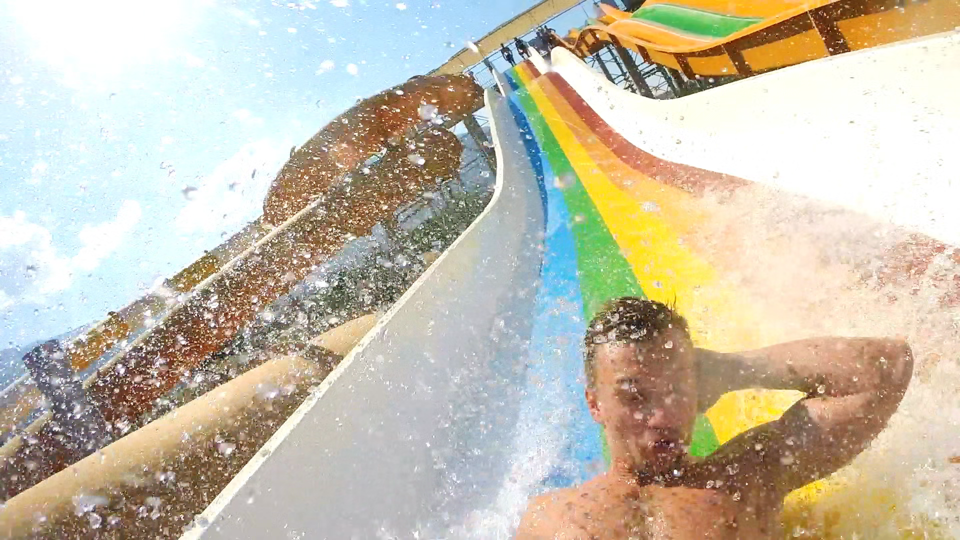 Man Sliding Down At Water Slide In Aquapark Guy Having Amusement And Enjoying Active Rest On Resort Male Tourist Filming Himself During Vacation Concept Of Summer Holiday Slow Motion Close UpÂ
