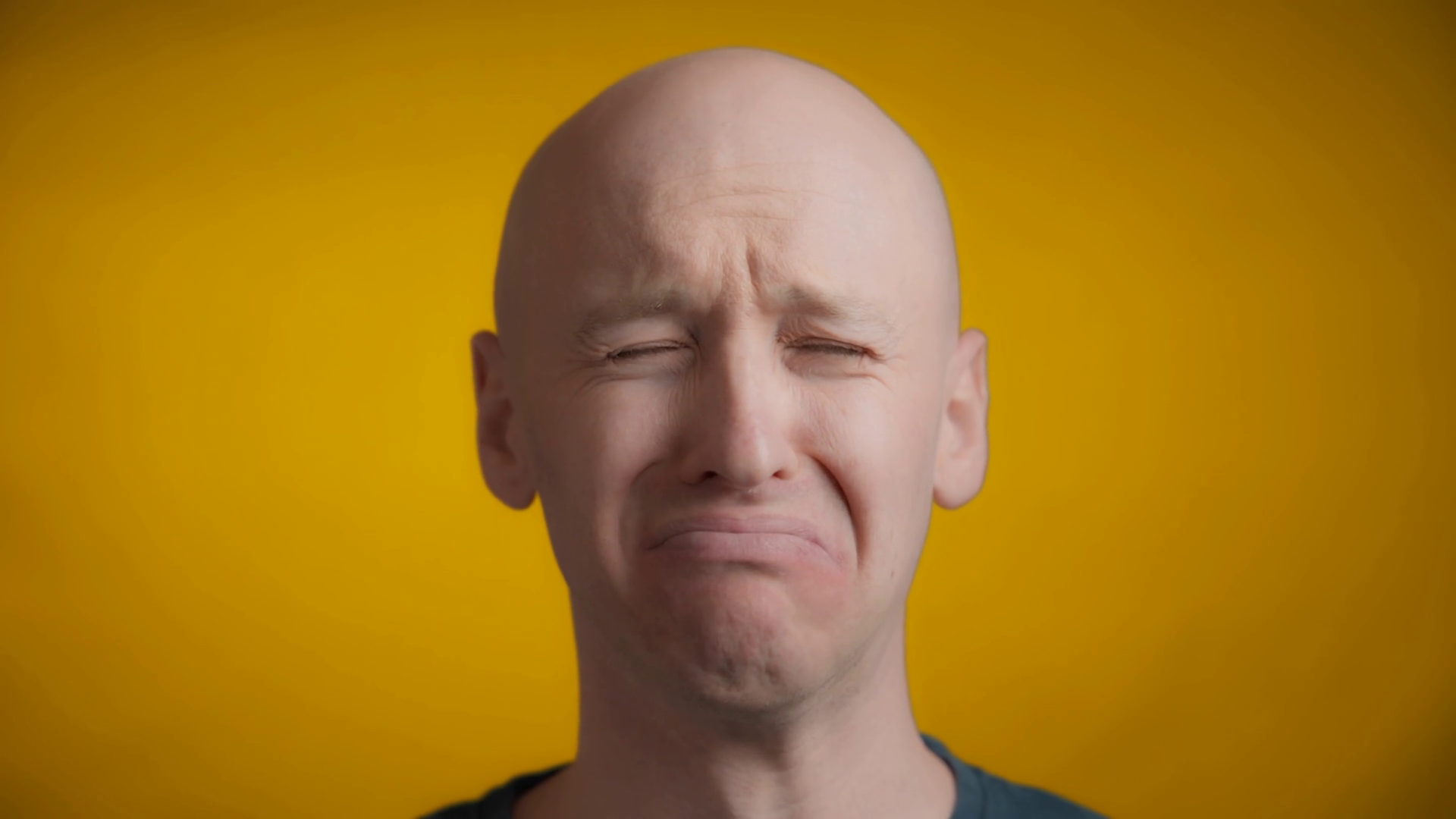Man With Blue Eyes And Bright Skin Looking Straight Towards The Camera And Makes A Weeping Face On A Yellow Background Real TimeÂ