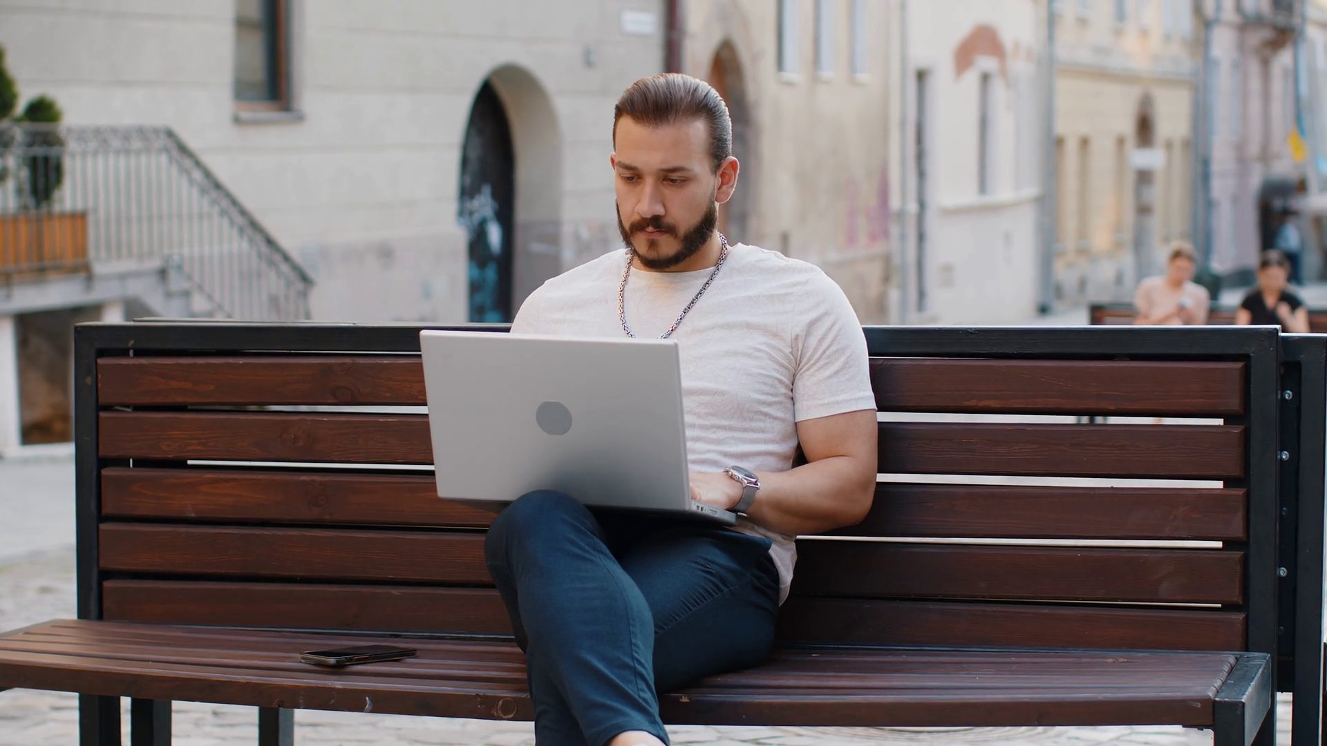 Man Working Online Distant Job With Laptop Browsing Website Chatting Sitting On City Street BenchÂ