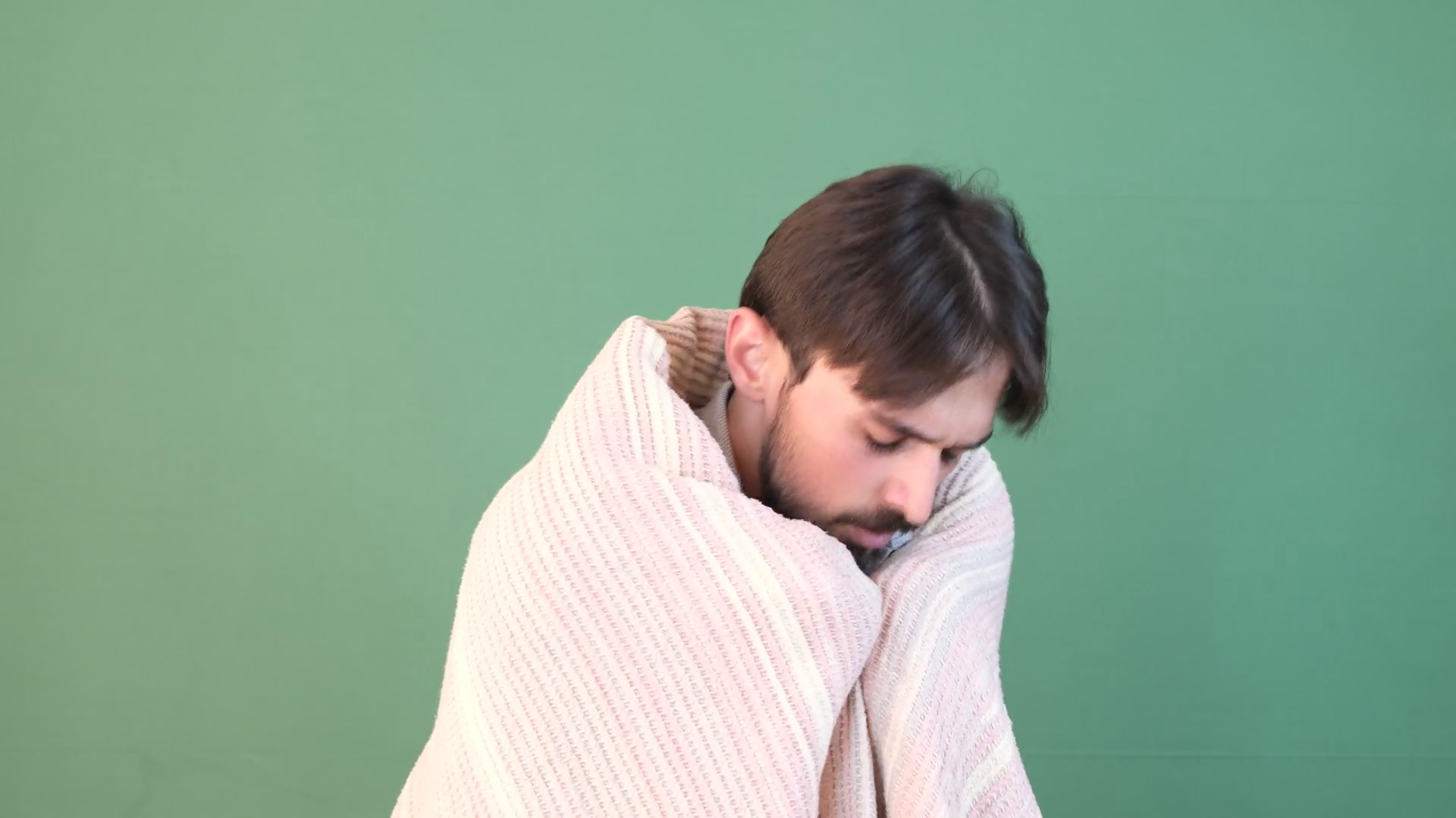 Chilly Man In Blanket Winter Sadness At Green BackgroundÂ