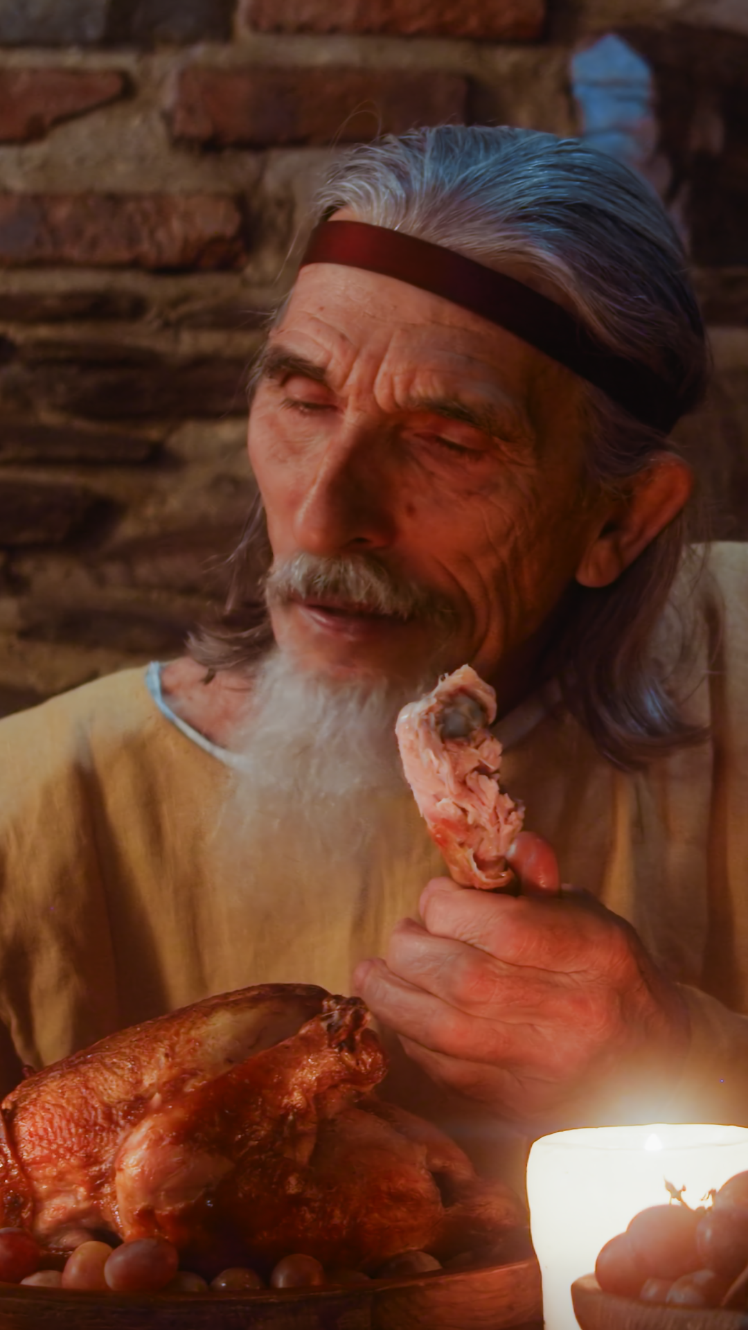 Mature Feudal Lord Has Meal In Medieval Castle Elderly Man Guest Opens Wooden Pint And Drinks Ale At Dining Table In King Castle Dark AgesÂ