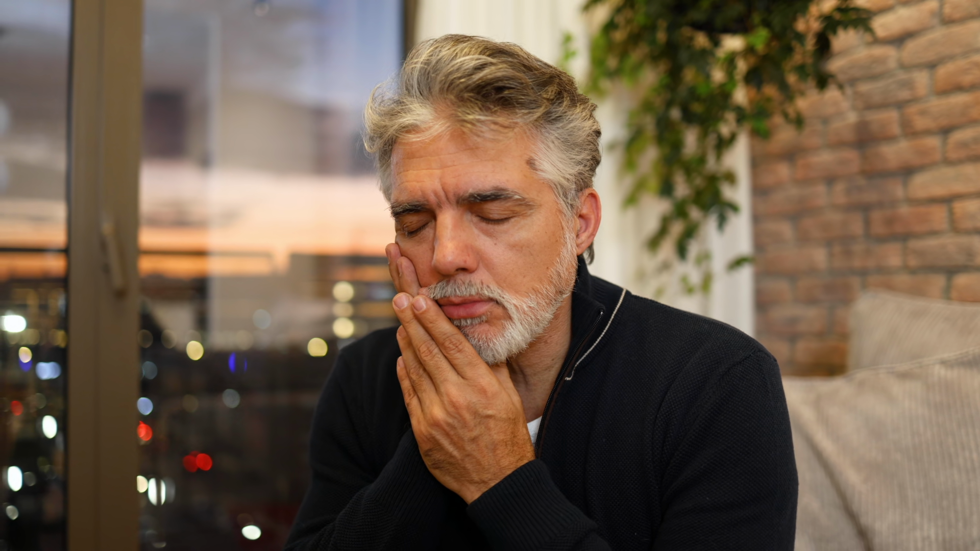 Mature Man With A Beard Suffering From Intense Toothache Pain Rubbing His Jaw And Cheek At Home In The EveningÂ