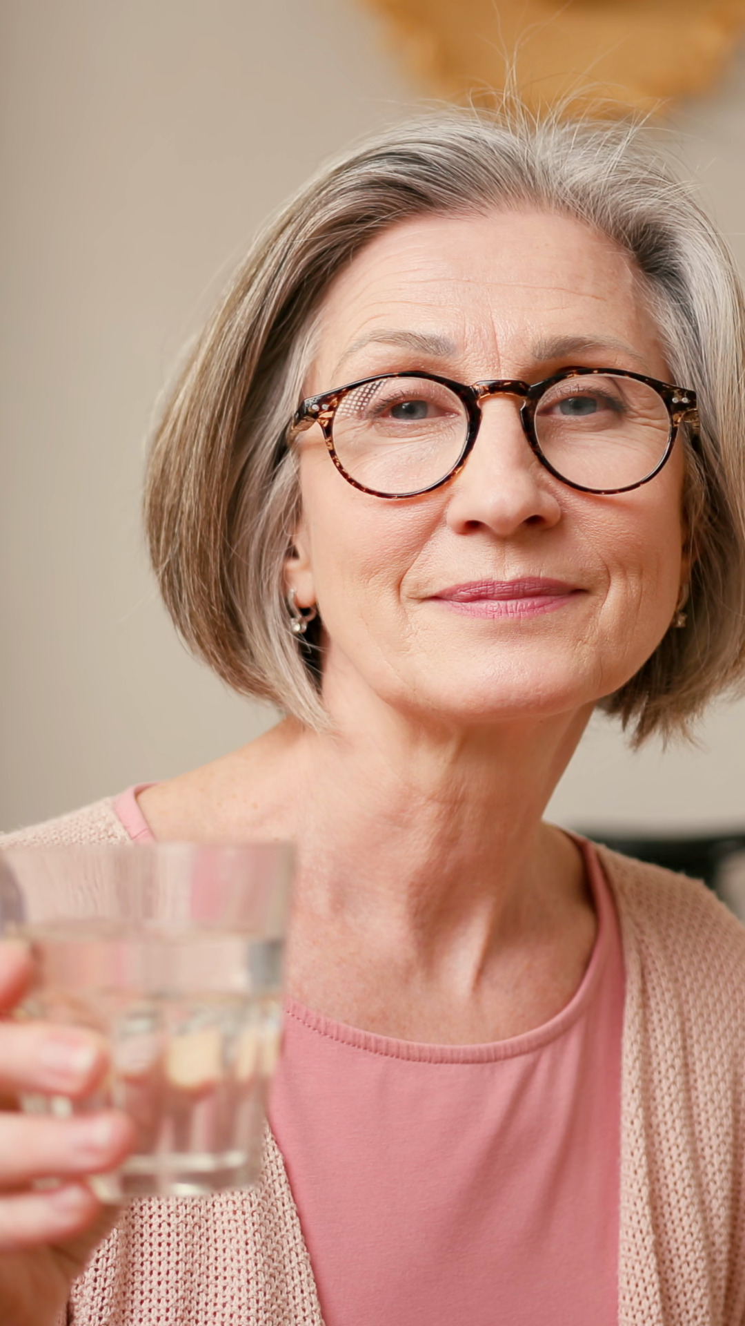 Mature Old 60s Woman Older Middle Aged Female Customer Holding Glass Of Water And Drinking It On Couch At Home Stay Hydrated ConceptÂ