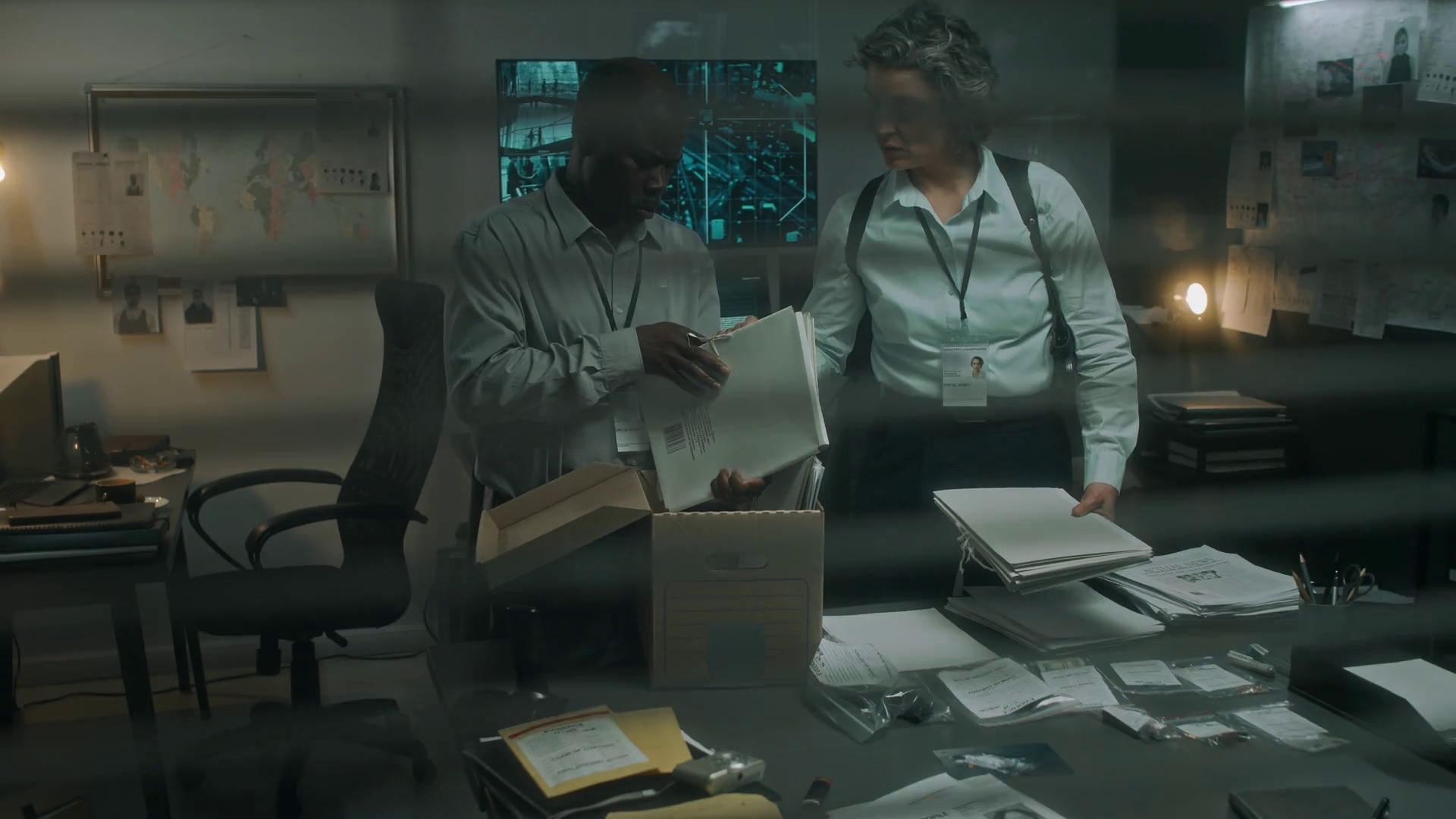 Medium Full Shot Filmed Through Window Blinds Of African American Male And Caucasian Female Law Enforcement Officers Looking For Information On Current Case In Old Archive Files Taken From StorageÂ
