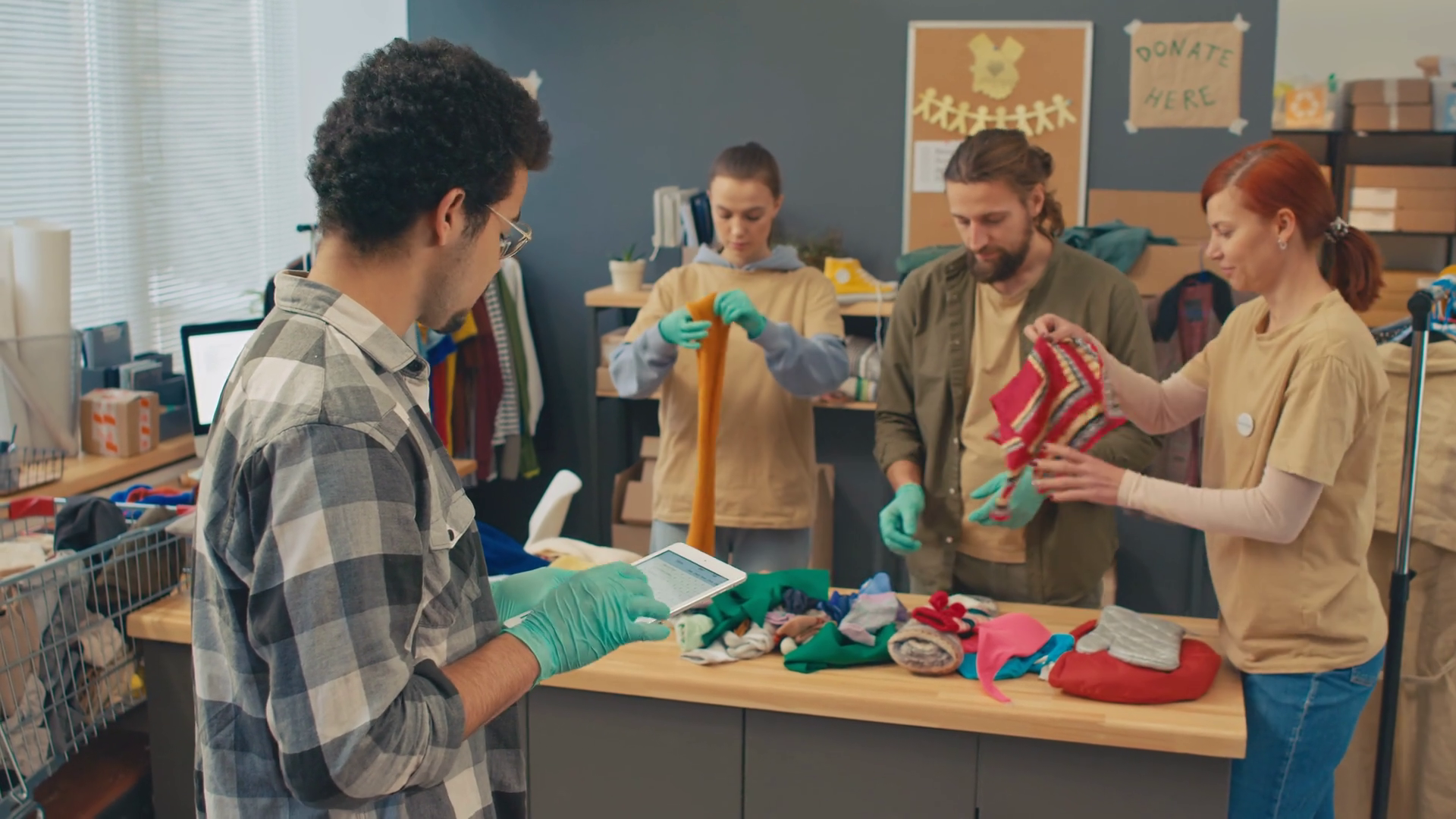 Medium Long Shot Of Male Administrator Of Charity Project Looking At Group Of Volunteers Sorting Secondhand Clothes For Shipping To People In NeedÂ