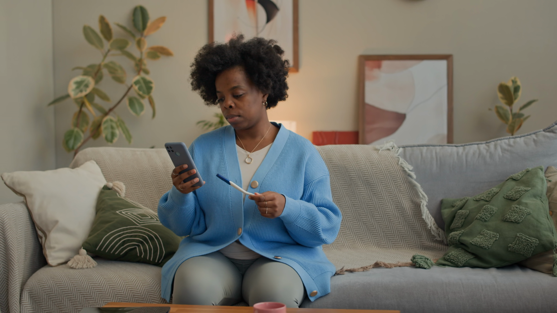 Medium Long Shot Of Young Black Woman Getting Result Of Pregnancy Test And Checking Smartphone While Sitting On Cozy Sofa In Modern Living Room With Abstract Paintings In BackgroundÂ
