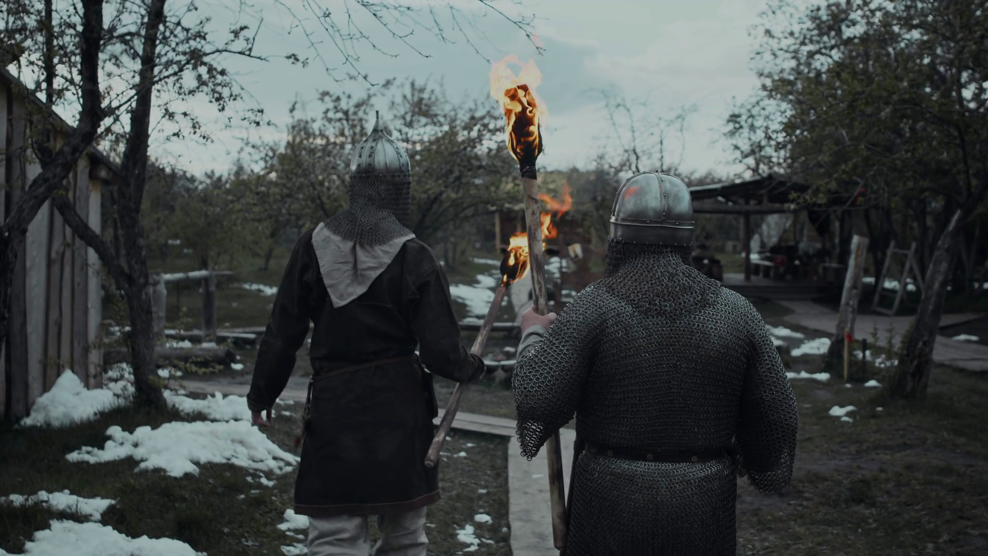 Medium Rear Follow Shot Of Two Knights In Chainmail Armour And Helmets Walking Through Garrison Yard Carrying Burning Torches Past Wooden Huts In Spring Evening Snow Lying On GroundÂ