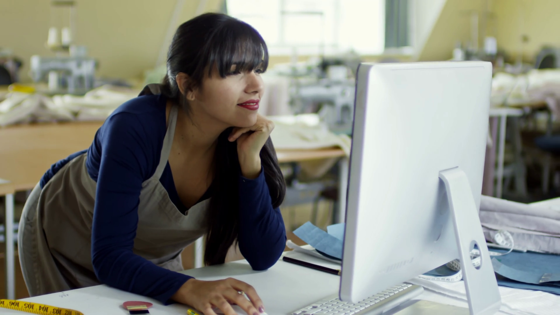 Medium Shot Of Optimistic Hispanic Woman In Apron Using Desktop Computer When Working On Fashion Collection At Sewing FactoryÂ