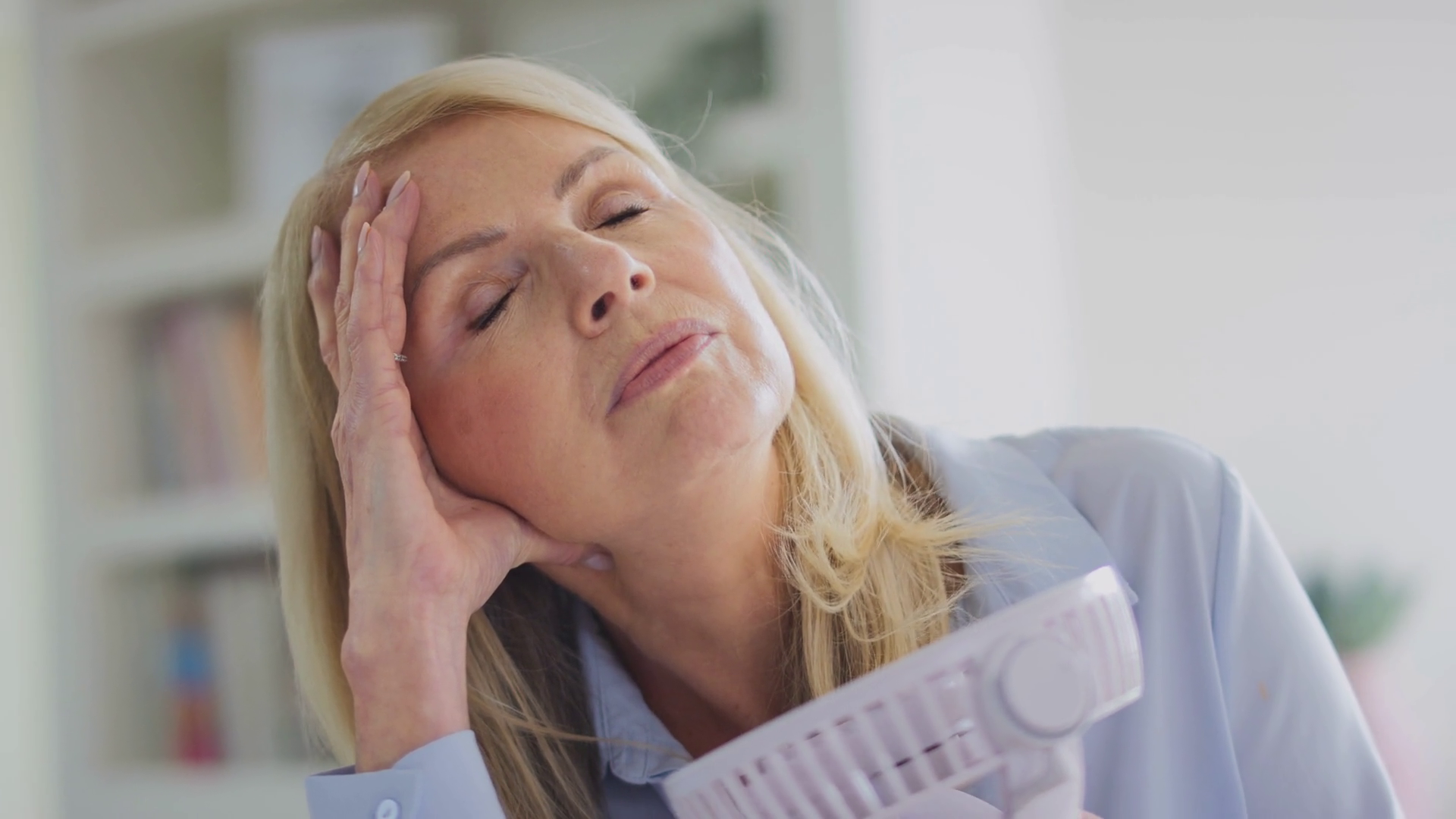 Menopausal Mature Woman Having Hot Flush At Home Cooling Herself With Electric FanÂ