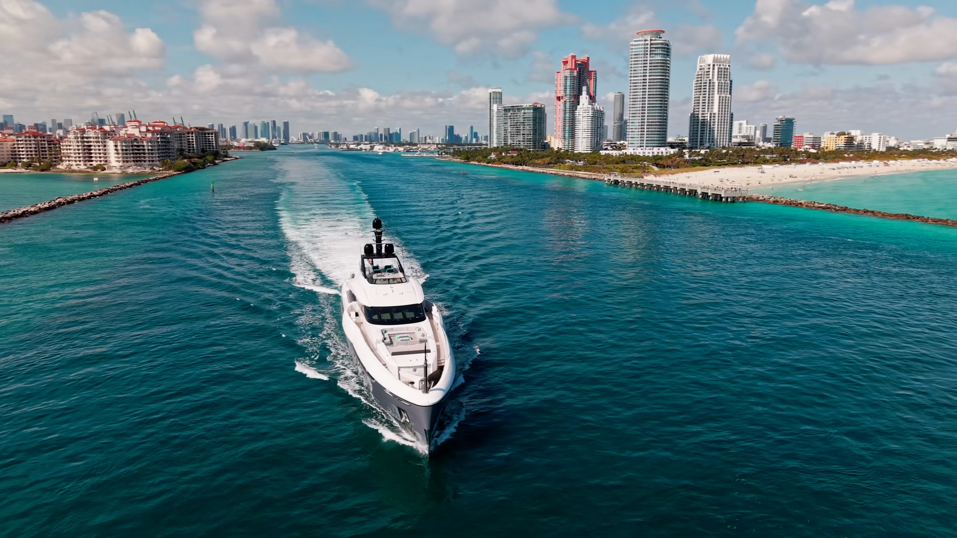 Miami Canal Aerial Footage With Yacht Boat Aerial Luxury View On Sea Canal Boat Leaving Miami Port Luxury Motorboat Yacht At Sea LuxuryÂ